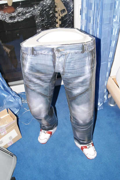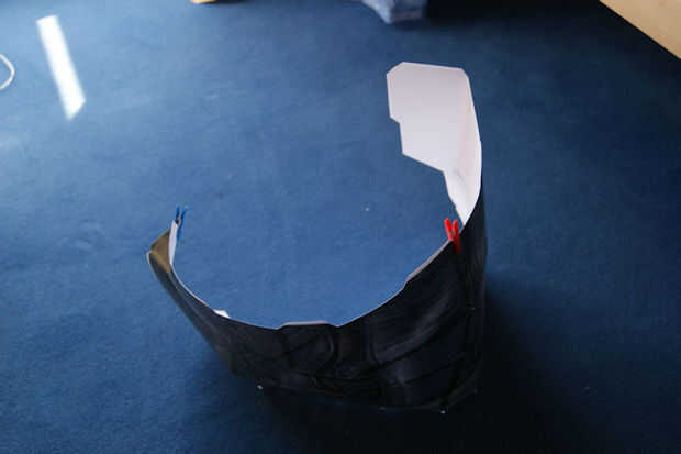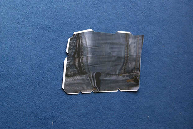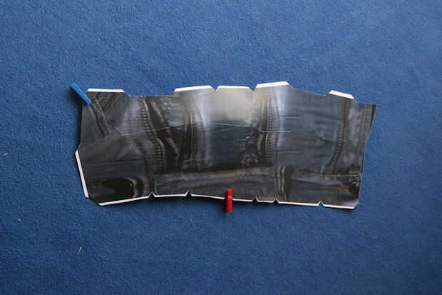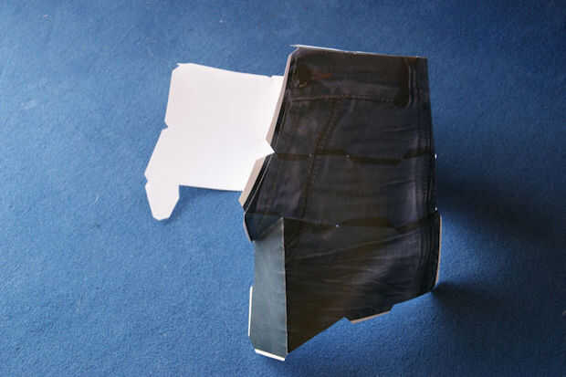 3. La pierna derecha del pegamento y pegar ambas piernas juntas y la segunda placa de cartón sobre la cadera.
