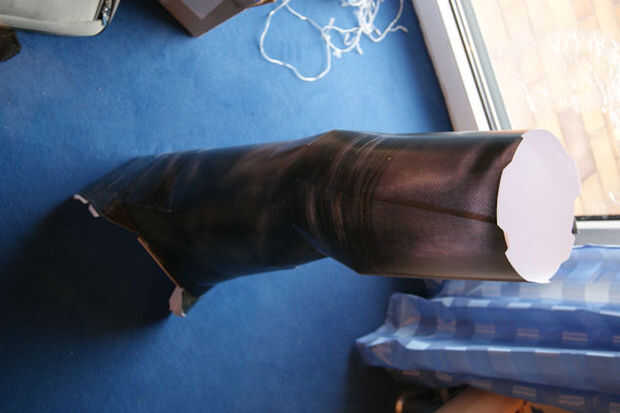 2. Unir el zapato y al final de la pierna L 19-22 L y adjuntarlo a la pierna. Luego pegar la suela de cartón (otra vez puede hacer un agujero en la placa) en la parte inferior.