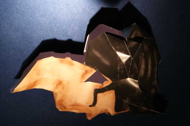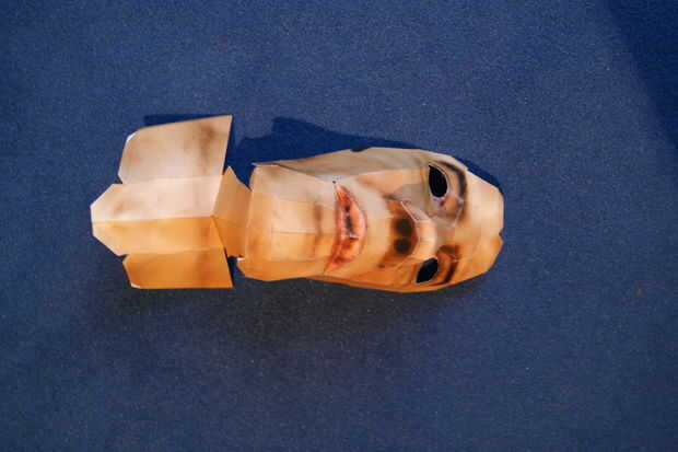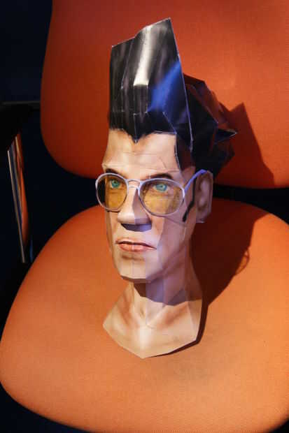 3. Para las frágiles gafas de sol, cortar primero la parte interna, luego pegar las gafas naranja detrás de ellos recórtalo y gracia la cara de Travis con ellos.