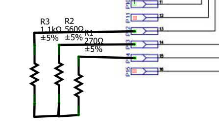 P12 obtiene la resistencia k 1.1 P13 obtiene la resistencia de 560 ohm y P14 obtiene el resistor de 270 ohm.