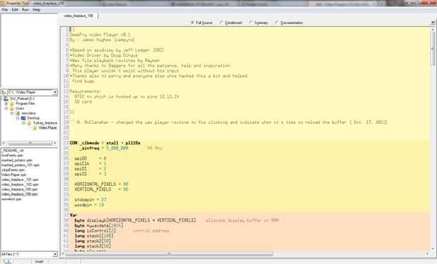 Independientemente de su sistema operativo, usted debe también tomar el código fuente, en caso de que desee modificar / cambiar / modificar el programa. Es en un archivo zip, el objeto superior es 'video_fireplace_190.spin'.