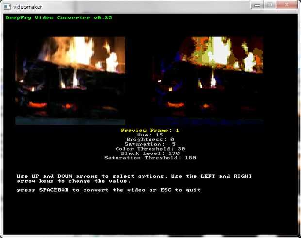 Haga doble clic en 'Convert_AVI.bat', y procesar el vídeo. Una vez que termina, otro cuadro de diálogo le permitirá ajustar la conversión final. Usted puede cambiar la saturación, tono y nivel de negro para mejor adaptan a su fuente de vídeo. Cuando finaliza, el archivo de salida final será 'fro.pvf' ubicado en el subdirectorio / convertir.