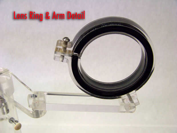 Este aparejo probablemente trabajaría con casi cualquiera de los productos de Canon o Nikon, pero los anillos que sujete a los anillos de zoom y el enfoque tendrá que ser construido para que coincida con cada objetivo particular. También utilizar una lente de longitud focal fija de 55mm para ciertas tomas, y sólo un anillo de enfoque es necesario para ésta. Pero estos anillos pueden simplemente ser dibujados en el papel de acrílico grueso de 1/2 pulgada respaldo y recorte con una sierra de banda. El interior dimensión es bastante crítica, pero poco material se puede retirar en la ranura de fijación para permitir que el anillo de abrazadera firmemente. Utilicé tornillos de máquina 10/24 para la abrazadera de sí mismo, y 8/32 tornillos para sujetar el activador nudillo al ring.