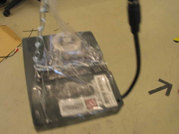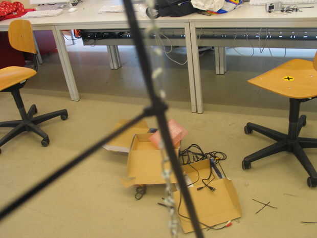 -Palillo sus pantallas LCD horizontalmente en el extremo de las cadenas con cinta -Gancho les para arriba en un lado del cable de salida de vídeo/audio -El cable con el cable de la correa con las correas de plástico -Poner los túneles de tela sobre las pantallas del LCD y atarlos con un trozo de cuerda
