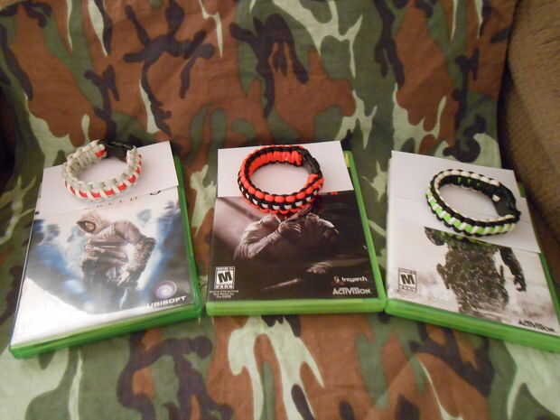 pulseras Paracord hacerlo con un Flatline o trazador (Flatline es un filamento de Paracord con la cadena de centro sacado y trenzado en la parte superior de un brazalete de Paracord y un trazador es un pedazo de micro paracord trenzado a lo largo de