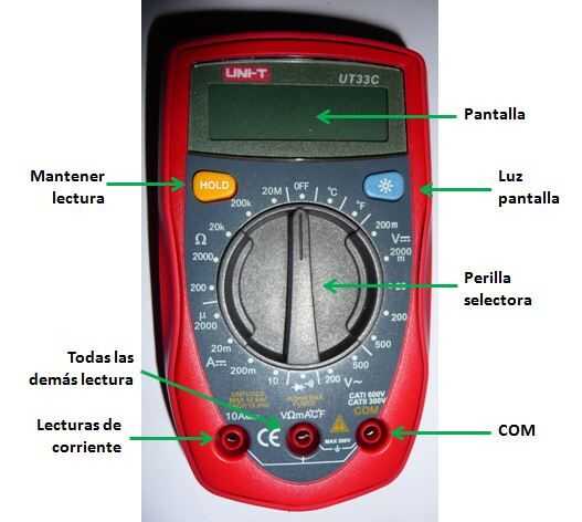 En esta foto se pueden ver los principales componentes del multímetro y su función principal.
