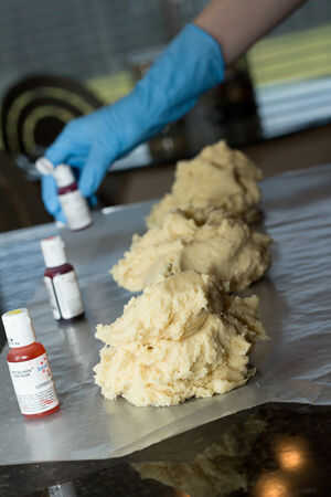 5 dividir la masa en tres partes iguales. Añadir unas gotas de rojo marrón y colorear a la primera sección, verde a la segunda, a la tercera. Amase cada sección de la masa hasta que la coloración se extiende uniformemente a lo largo. Envolver la masa y guardar durante la noche en la nevera.