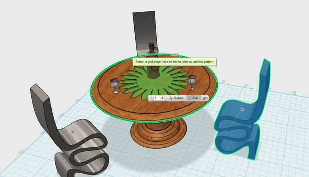 Este es el paso final, y en este punto haya terminado de crear todo. Hacen que todo permanezca en posición vertical, y usando la herramienta de alineación, asegúrese de que cristal le vino está en centro de la mesa. Elevar, por lo que es en el centro en la parte superior de la tabla. Desde aquí, mover un poco hacia afuera. Ahora con la herramienta del patrón de círculo, establecer el eje como el borde del círculo de la tabla y el sólido como la Copa de vino. Hacen sin embargo muchas copas que quiera, pero asegúrese de que tener el mismo número de vidrios y sillas. Ahora haga lo mismo con la botella de vino, pero no utiliza ningún patrón en él, dejarlo un poco lejos del centro. Finalmente, para las sillas hacen una distancia de estar lejos de la mesa y se utiliza el patrón circular, con la tabla como el eje y la silla como el sólido. Eso es todo! El juego de mesa, silla y vino está terminado y listo para imprimir.