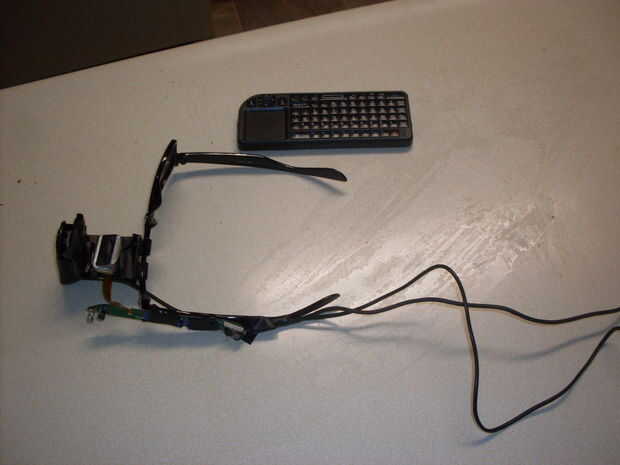 desmonté el Vuzix y como pueden ver usé un bracer plástico y cinta adhesiva sujetarlo a las gafas es no lo que quisiera de querido pero por ahora funciona. quería sólo uso que un proyector pero no pudimos encontrar una en mi precio sonó y que los pequeños.  Tomé también tomó una foto del teclado elegí creo que tienes que tener este uno pero me gusta este uno así que pensé compartir. una vez que esté todo trabajo puede utilizar tiras de plástico (corte hasta el borde del como una lata de café) y cinta adhesiva para que se vea mejor también sería deshabilitar el hing las gafas que yo sé que eso es un dolor pero es mejor que reemplazar los cables. también puede ver usa la web cam asignar aquí la parte que sostiene también la pantalla o su soporte desmonté y uso la paz de proctor y sostener la leva hacia fuera así que puedo cinta de mi día de puede tomar fotos en lugar de virar notas en clase. el único lado a esto es la distribución de peso es necesario pensar en una forma yo eve a cabo.