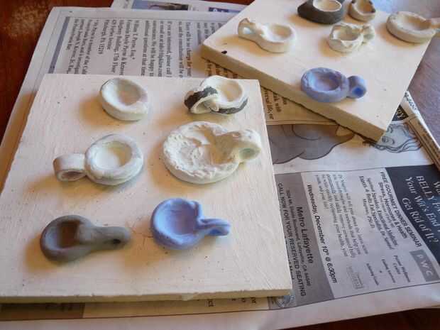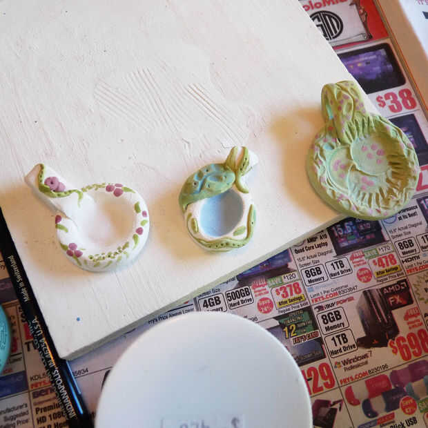 Me gusta pintar una capa de esmalte de alta temperatura en la parte trasera de la botonera y 3 a 4 capas en la parte delantera. Esto que la espalda no se pegue al soporte o parrilla en el horno. Con un proyecto como este, he divertidas combinaciones de color diferentes en todos los colgantes de la pintura. Debido a las reacciones químicas con el vidrio a veces obtener resultados muy sorprendentes.