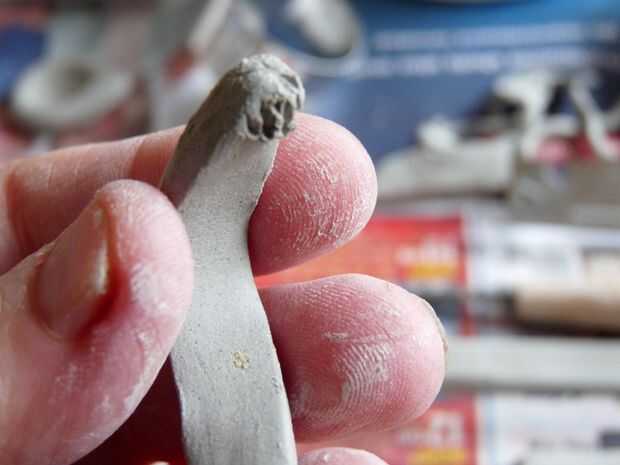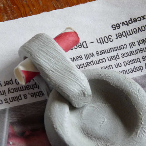 Ahora toma una de las tiras de arcilla que a hecho y había cortado a 2 pulgadas de largo. Usted puede hacer los bordes rectos o decorativos. Coloque la tira pequeña marcando (diagrama) uno de los extremos y añadir un poco de agua. Lo mismo para la parte trasera de la botonera donde se coloque. Pulse en la tira de la fianza en el colgante. Doble la tira sobre la paja y adjuntarlo a la parte delantera de la botonera de la misma manera. Puede dejar la paja en el lugar hasta después de la cocción. Se quema lejos, dejando la forma correcta para una fianza. (No tire la paja hacia fuera, pero si cae su propia, que está bien).