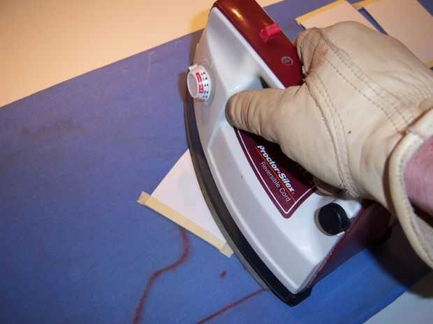 Asegúrese de que no hay agua en la plancha y póngalo en la posición más alta.  Una vez que la plancha está muy caliente comenzar a aplicarlo a la parte de atrás del papel.  Trata de cubrir todas las áreas de la plantilla con la misma presión y el calor.  Este paso es complicado. No es suficiente y no transferir el toner.  Demasiado y el papel puede obligar al vidrio.  Papel brillante transfiere la más fácil, pero también tiene una mayor tendencia a pegarse al vidrio.  Tenga en cuenta que cambios rápidos en temperatura hará que cristal se agriete.  Que estos poco a poco enfriar a temperatura ambiente. Resista la tentación de correr debajo del fregadero!