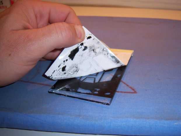Una vez que el vidrio tiene coolled, tire con cuidado el papel de la Copa.  La mayor parte del toner debe permanecer sobre el vidrio.  Lamentablemente el libro sobre la plantilla de monja Ninja consiguió demasiado caliente y no he podido quitarlo sin dañar el toner.  Si esto sucede, puede limpiar el vidrio con diluyente para laca y vuelva a intentarlo.