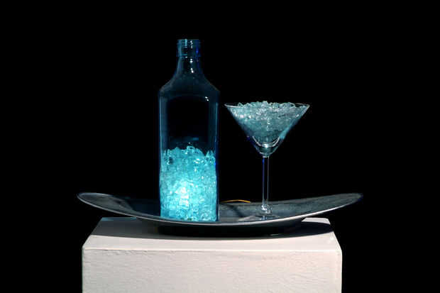 Wiire por unos LEDs, resbalón en la botella y en la Copa de martini, llenar em ambos para arriba con pedacitos de vidrio roto, luego los LEDs en la luz en lugar de los LEDs originales de la noche de alambre las cosas todo se enciende en la oscuridad y ahorra energía en el día, buscando fresco todo el tiempo.