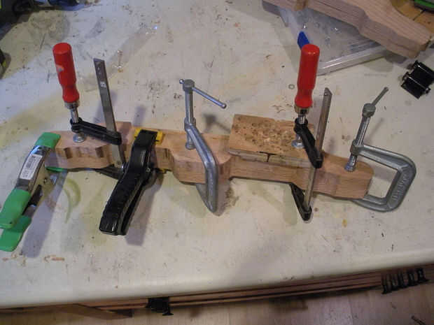 - Cuidadosamente y aplique la otra pieza y firmemente la abrazadera. Cuidado de no mellar la madera con las grapas.