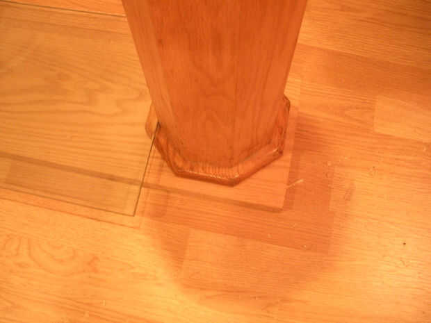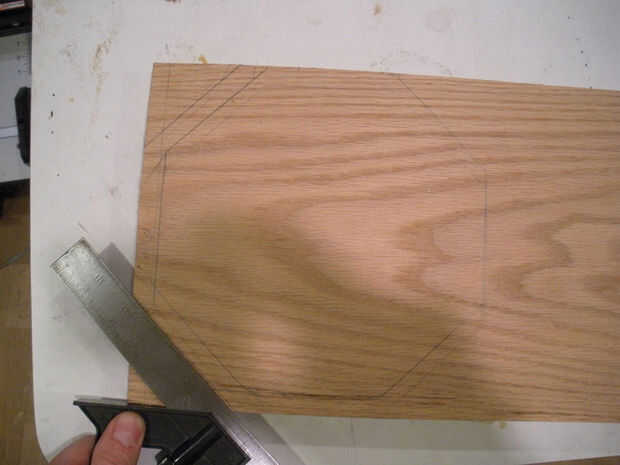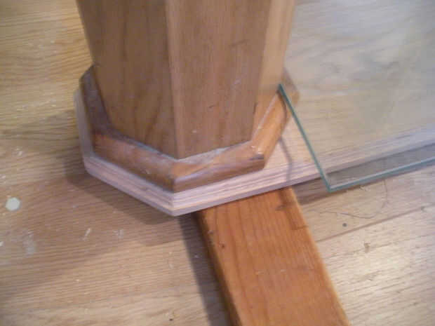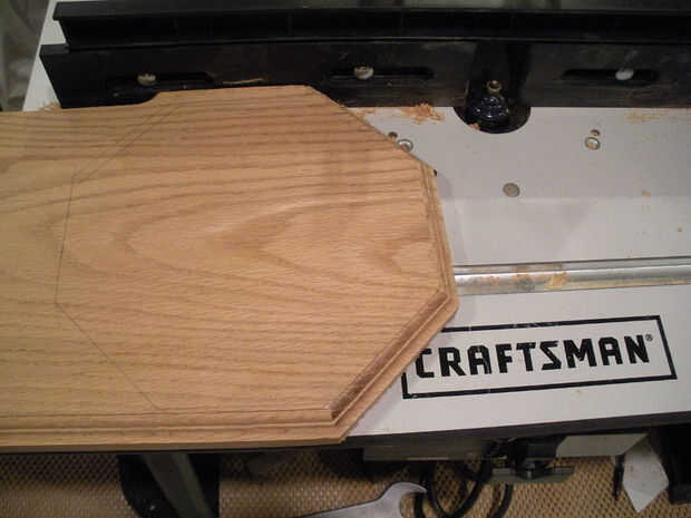 Los dos postes se unen a una placa base routered con los extremos del octágono que coincidan con los postes. Los bordes de la placa base son routered en donde estarán los puestos. Ver última imagen