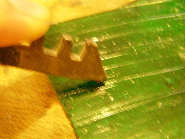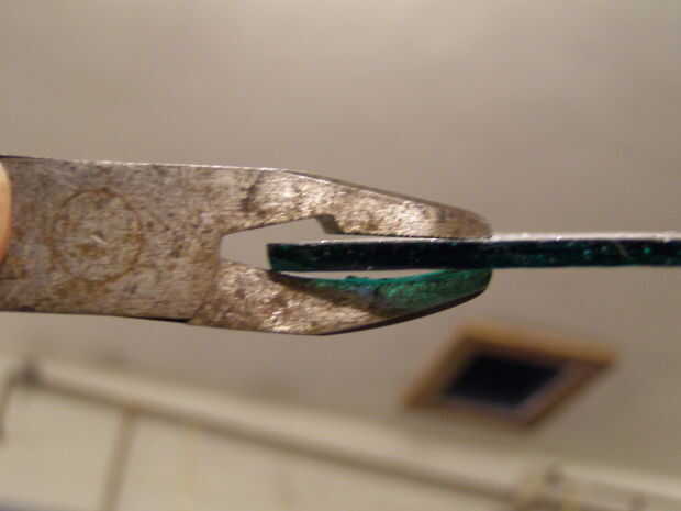 -El cortador de cristal sólo araña la superficie. Si usted está cortando una pieza grande puede poner el cero sobre el borde de la mesa para romperla. Si es un pedazo pequeño entonces alicate el grozing para sacar el exceso de vidrio. Los bordes no tienen que ser perfecto si se utiliza un molino. Si no tienes un molinillo, entonces utilizar los alicates grozing para limpiar los bordes. Mira la fotografía para ver cómo deben celebrarse el grozing alicates. Si les mantienes la otra manera tienes una buena oportunidad de romper el vidrio.