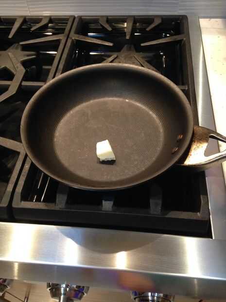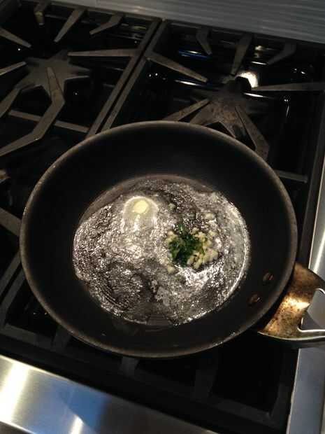 Derretir la mantequilla en una sartén pequeña-mediana y Agregue ajo, 1/2 las hierbas picadas y una pizca de sal y pimienta. Revolver suavemente a fuego alto.