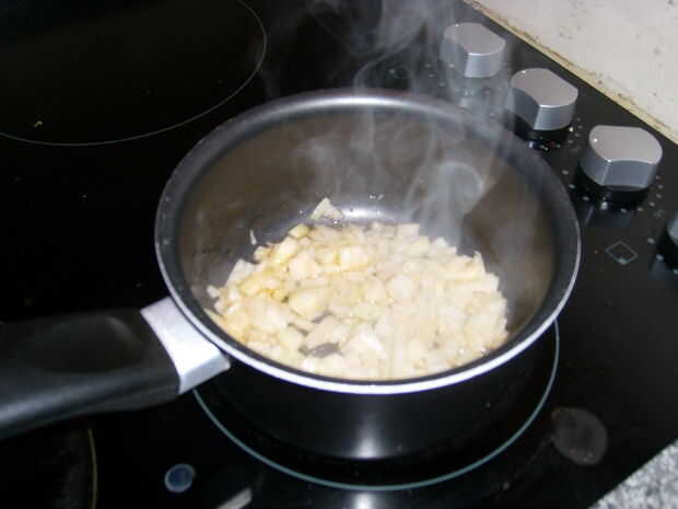 2. Freír suavemente a cebolla en la sartén con un poco de aceite hasta que comience a ir transparente, entonces añadir el ajo y la pimienta. (no añadir el ajo con la cebolla o se cocinan para rápidamente, grabar y hacer la salsa un poco amargo) cocinar hasta que las verduras estén blandas.