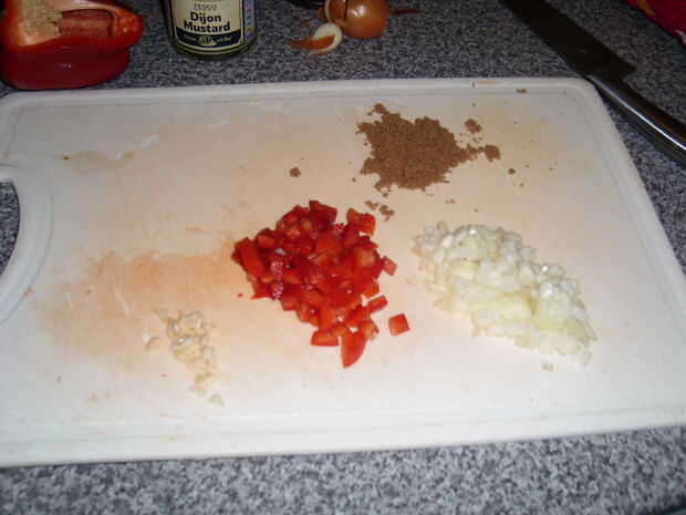 1. Picar el ajo, la cebolla y el pimiento. Fue por dados finos, pero si usted está mezclando la salsa chunky está bien.