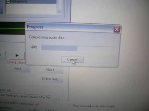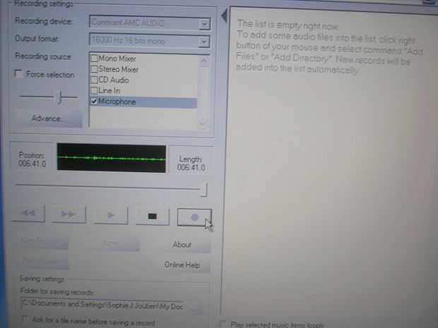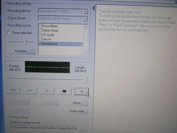 el programa es muy fácil de usar, si tienes cualquier duda sobre este programa, ver mi película. Esto debe ayudar con todo el proyecto sino que también ayuda con el programa. pero se puso por escrito, primero abrir el programa, (Asegúrese de que su gato del micrófono es reconocido por la computadora, encendiendo en la barra de herramientas donde está el icono de sonido) al tornillo con el juego del programa su expediente y ver si el programa reconoce que no hay sonido a través de la computadora. Si es así, pulse el botón de grabación. Esto debería empezar un tiempo récord. Si todo funciona sin problemas que el expediente seguirá desempeñando hasta el final. Cuando haya terminado pulse guardar botón y una grabación #1 aparecerá en el lado derecho. Si el sonido es largo el programa tendrá comprimir la canción (como en la imagen).