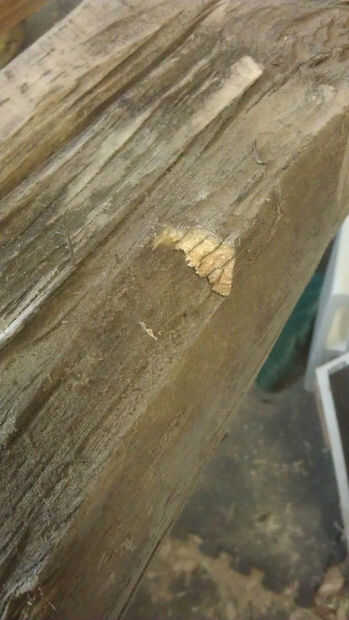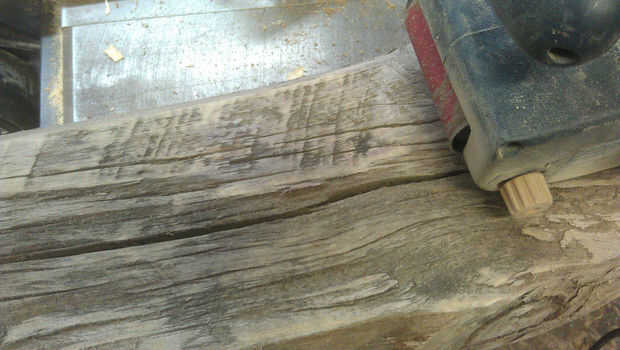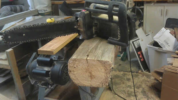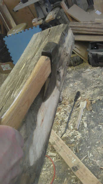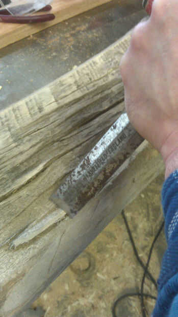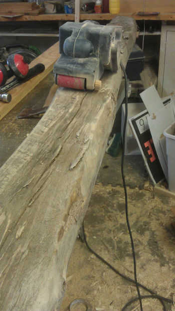 Después de medir cuidadosamente la anchura sobre la chimenea, se utilizó una sierra eléctrica para cortar el registro de. Un avión de hacha y de la mano fueron utilizados para acoplar algunos de los puntos altos en la parte trasera por lo que sería sentarse contra la chimenea. Porque la parte superior del tronco era el anterior fuera del edificio, algunos alisado fue requerido. Se utilizó un cincel para quitar algunas astillas grandes y una lijadora de banda hizo el resto, dejando las marcas de Sierra de la molienda original.