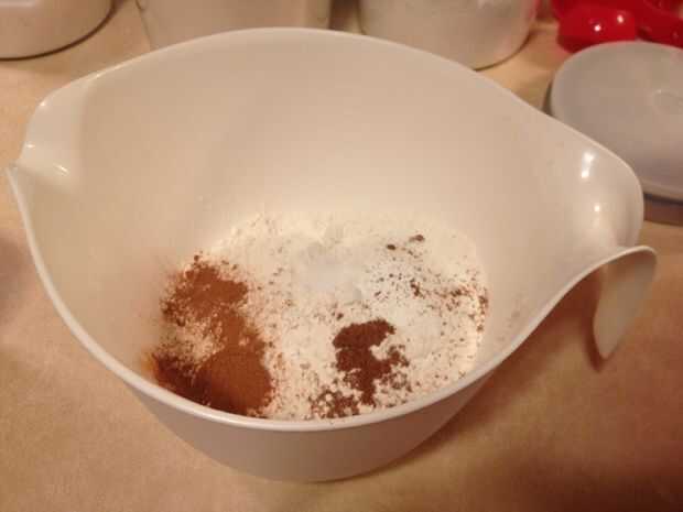 Combinar la harina, bicarbonato, polvo de hornear, canela, nuez moscada y la sal en su primer tazón. Mezcla uniformemente usando un batidor o espátula. La mezcla debe ser un color y una textura incluso después de que mezcle los ingredientes secos. Apartar la mezcla seca.