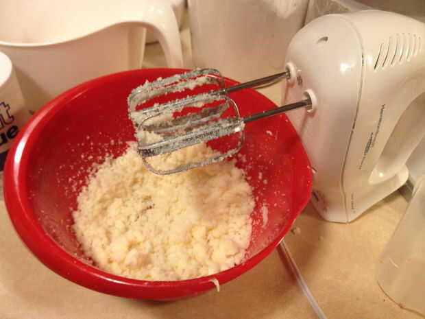 Ahora, utilizando una segunda mezcla del tazón de fuente, utilice una batidora eléctrica para batir el azúcar y la mantequilla juntas hasta que estén bien mezclados. Mezcla debe tener la consistencia de la segunda foto.