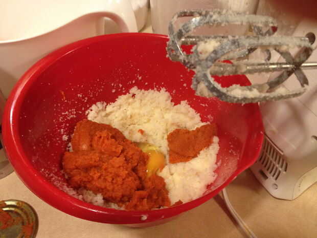 Ahora agregar en la taza de calabaza (será menos que el conjunto puede,) huevo vainilla extracto y batir hasta que la mezcla es lisa y uniformemente distribuida. Comencé en una posición más baja de la batidora, y gradualmente dio vuelta la mezcla más de una vez todo mezclado.