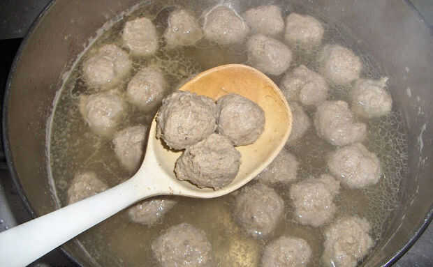 Frotar unas gotas de aceite vegetal en una mano. Coge un puñado de la pasta de carne y cerrar su mano en un puño, apretando hacia fuera de una pequeña porción de la mezcla, aproximadamente 1 cucharada, entre el pulgar y el dedo índice. Mantener rodando y exprimiendo la misma porción entre sus dedos pulgar e índice hasta obtener una bola lisa redondeada. Sacar las albóndigas con una cuchara engrasada.