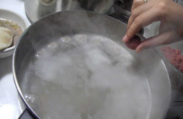 Bolas de la gota en agua a fuego lento y cocine hasta flotante