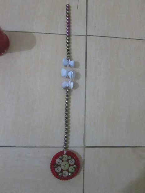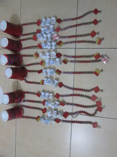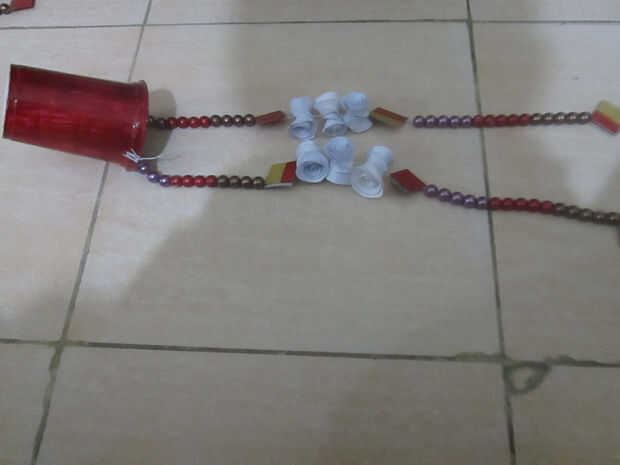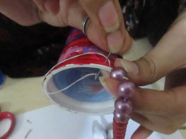 Ahora toma una taza de papel y esta puntada con él con el hel-p de hilo y aguja.