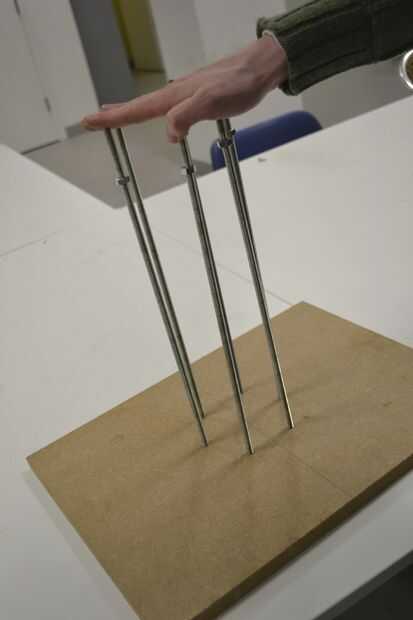 Usando los agujeros verticales en el hexágono como guías, seis agujeros fueron perforados a través del tablero del MDF y varillas roscadas fueron Unidas en el lugar por las tuercas de cabeza embutidas en la parte inferior con las tuercas de nylon.