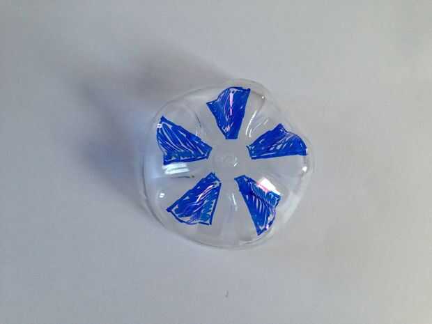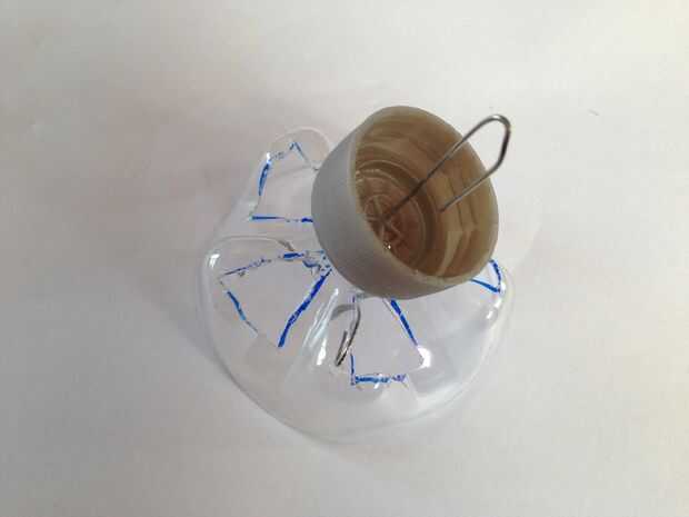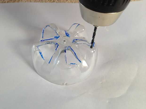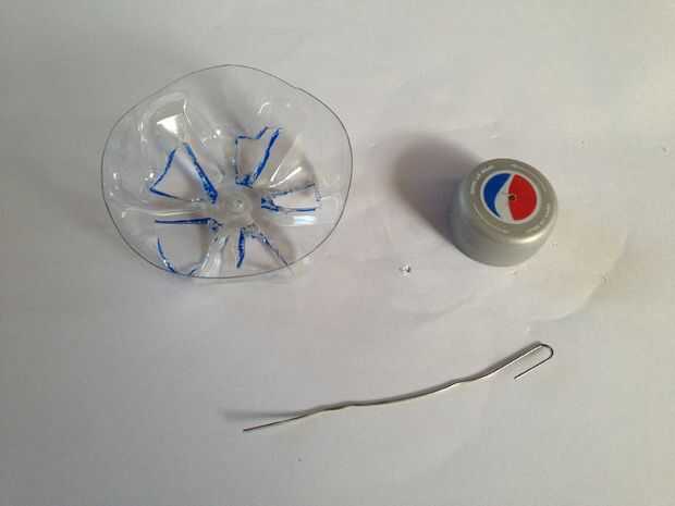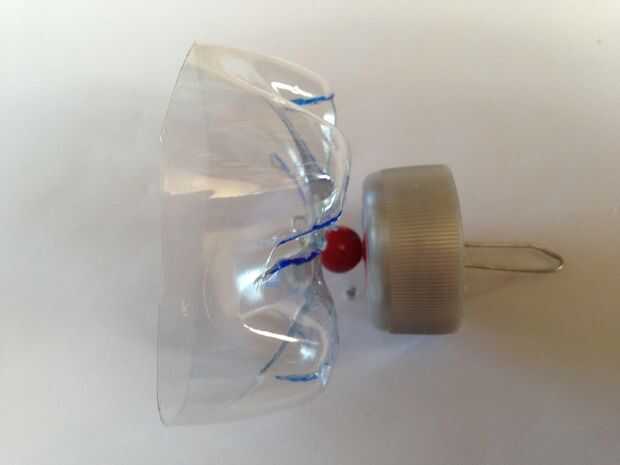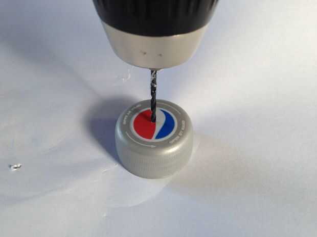 Luego perfore un agujero en el centro de la hélice y la otra botellas tapa, apenas lo suficientemente grande como para un clip de papel. Taladre un agujero de offset en la hélice para bloquear apagado el clip de papel también.