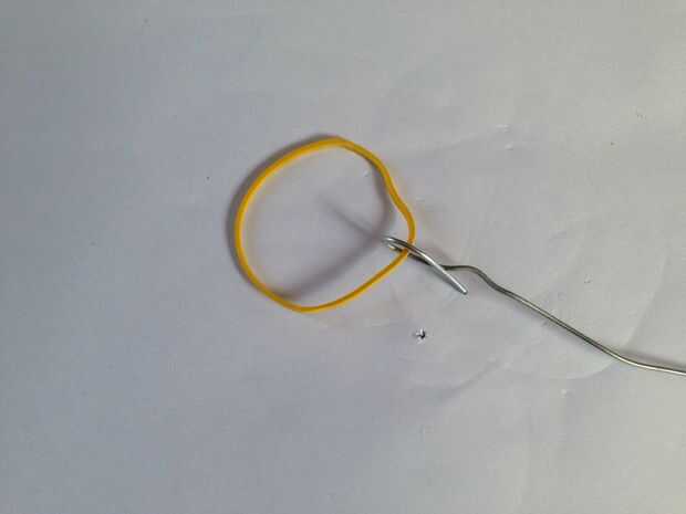 Fije la banda elástica entre dos clips de papel, usted necesitará utilizar el alambre largo enganchado a ello - usando a 'pescar' dentro de la botella.