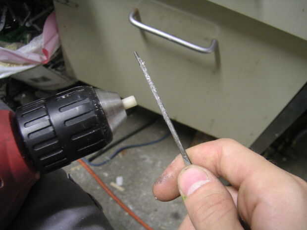 Ahora, usted necesita un archivo y mientras gira el taladro presentará a la cera para hacer la forma deseada anterior. Me enteré que funciona mejor si un poco calor el archivo y utilizarlo inmediatamente mientras esté todavía caliente. Hacer una plantilla como en la última foto, por lo que en el perfil se ve como la letra H donde irá el cable.