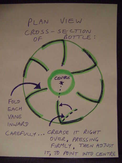 Cada paleta corte de la curva hacia adentro. La curva debe ser a medio camino entre cortes verticales que hiciste. Presione el plástico hacia el interior y doble doble (justo encima), por lo que toca el interior de la botella. Pellizcar, hacer un pliegue agudo todo el camino de arriba a abajo. Entonces la facilidad tira hacia atrás, así que su borde interior apunta hacia la línea central (eje) de la botella.