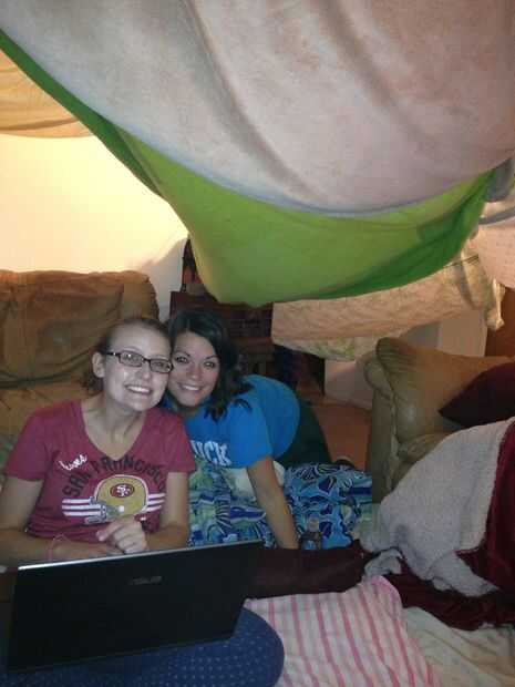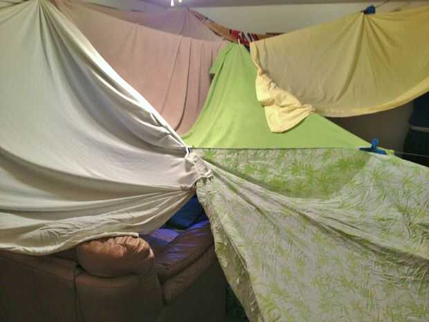 Ahora que tienes una web de paracord en toda tu casa, estás listo para comenzar a colocar mantas para formar la cáscara. Las intersecciones de paracord hacen un gran punto de amarre, se quiere atar nudos con la manta o utilice sus clips y pasadores para fijar la manta a la médula. Repita el proceso hasta que tenga una fortaleza que parece una carpa de circo falso patchwork :)