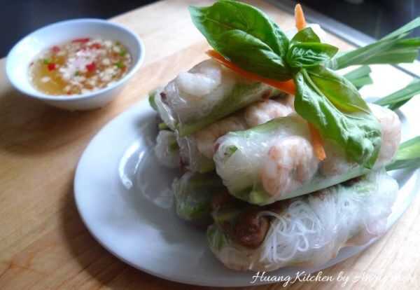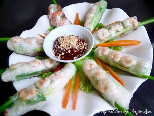 Estos rodillos de influencia vietnamita verano están llenos de carne, camarones, fideos de arroz y muchas verduras y hierbas frescas para sabor y crujido. Son super fresco, ligero, delicioso y lo más importante, saludables. Es un cambio refrescante de la habitual variedad frito. Sumergido en salsa de maní o salsa de pescado agridulce ligero, estos rodillos son ideales como aperitivo o incluso como una comida ligera.
