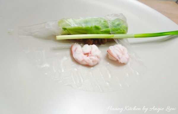 Paso 27: Y antes de llegar al final (antes de los camarones), doble un lado de la envoltura y añadir un ajo cebollino.