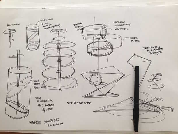 Si se mira a través de algunos de los gifs, puedes ver cómo exploró esta idea de simulación antes de incluso construir nada. Paralelamente, había esbozado un mecanismo que podría hacer esta escultura aparentemente imposible trabajar.