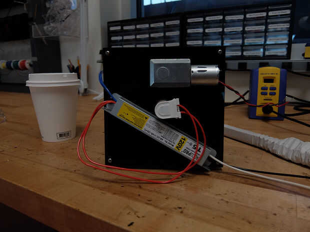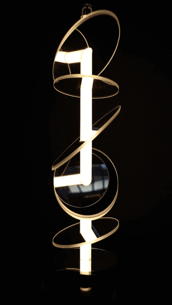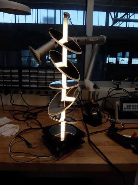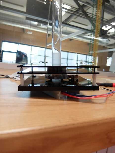 Los espejos son espejos de acrílico de un solo lado que se colocan espalda con espalda. Se cortan con precisión suficiente que se deslizan sobre el tubo de policarbonato (que es arena) y se queda allí debido a la fricción. Para evitar el uso de un anillo de deslizamiento, estoy girando el tubo de policarbonato (en el cual se adjuntan los espejos), mientras que la luz permanece en su lugar. El tubo gira a través de un tren de engranaje conectado a un motor muy lento. Algunos pseudo-mecánica-ingeniería más tarde, todo el asunto gira!