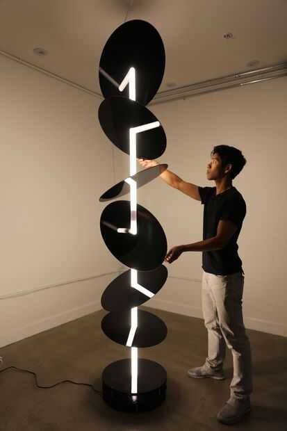 El primero de los dos. Decidí ir con dos columnas: una con acrílico negro para los discos y uno con el vidrio claro. Los nuevos materiales proporcionan la calidad reflexiva que quiero, pero en una forma mucho más sutil y sorprendente. Las proporciones se han modificado para que coincida más estrechamente con el modelo más pequeño. Los discos de spinning crean un 18" cilindro del diámetro, dando más espacio para las reflexiones respirar y permitiendo los discos a ser más espaciadas.