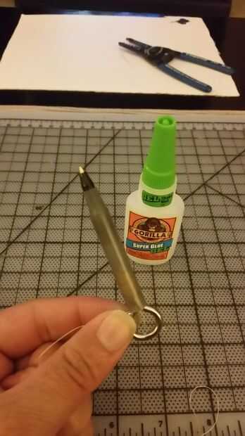 Empieza por tomar primero la cadena o eléctrica cinta (usado la primera vez) y abrigo de tornillo ojo un par de veces hasta su ancho apenas suficiente a la cuña en la pluma. Superglue envuelto ahora ojo y desliza en la abertura de la parte inferior de la base y colóquelo a un lado para curar. Una vez consolidada prueba tirando lo justo para asegurarse de que no vendrá aparte debajo de un mínimo de fuerza.