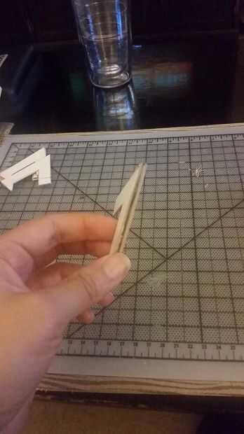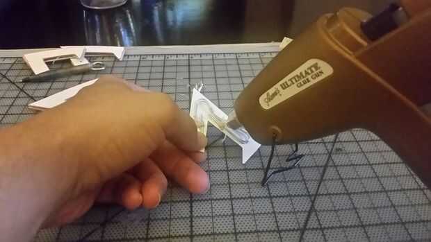 A continuación tomar la admite clip modificado, asegúrese de que está correctamente alineados para el gancho 1 y pegamento caliente en el lugar. Tomar un segundo gancho y pegamento caliente que uno en la parte superior para completar un gancho completo. Repita este proceso para el número restante de ganchos y soportes.