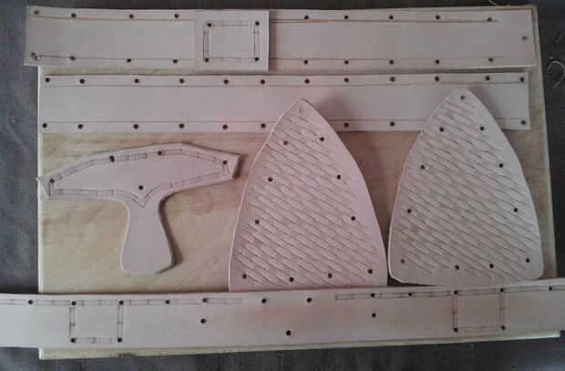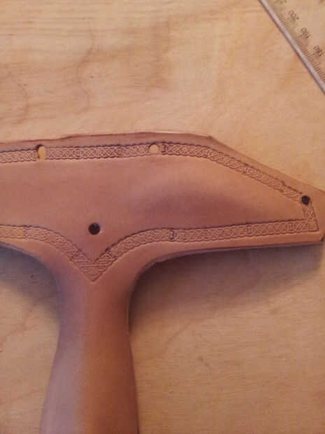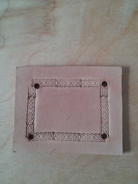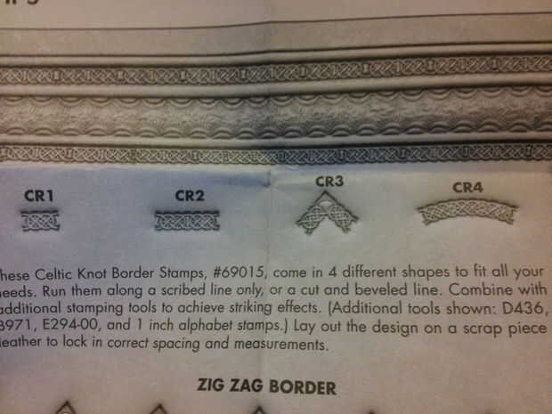 Nada grita vikingo como un buen chorro de celta nudos! En este paso voy a hacer algunos basketweave sellado en dos de los paneles, así como algunos Frontera Estampando en las bandas y protector nasal mediante un conjunto de sello de nudo céltico. Si eres nuevo en utillajes y estampación, asegúrese de ver los vídeos de cuero de Tandy en su canal de YouTube y en la práctica algunos desechos de cuero antes de pasar a la pieza final.