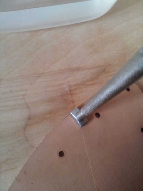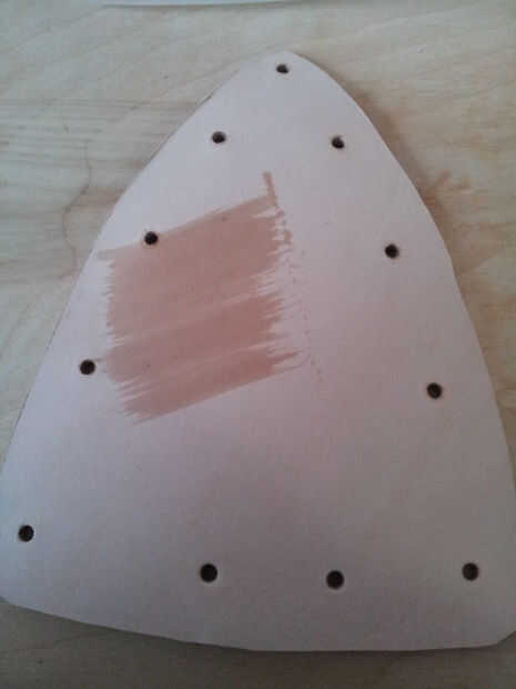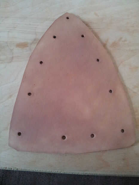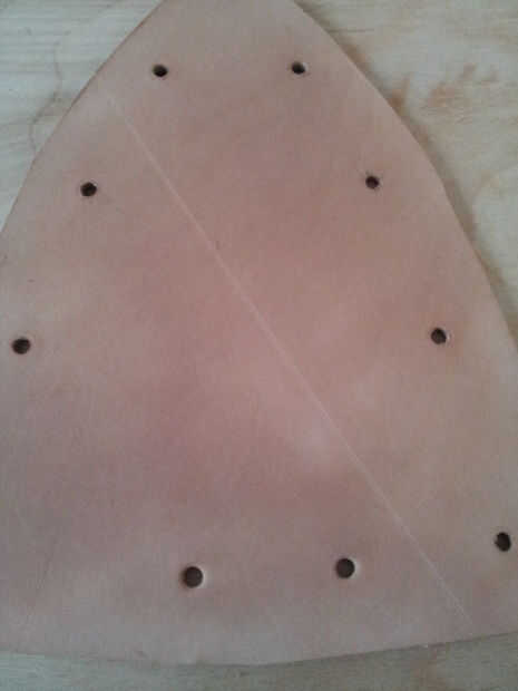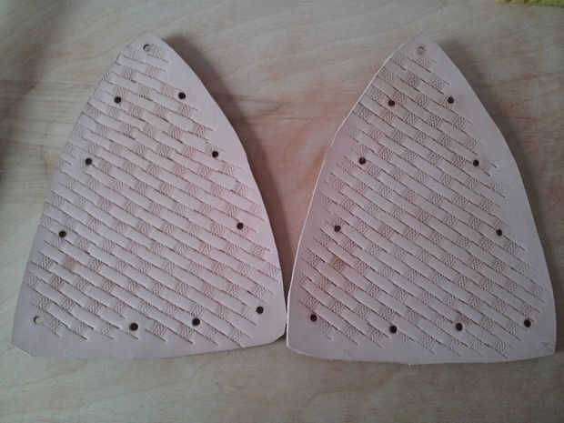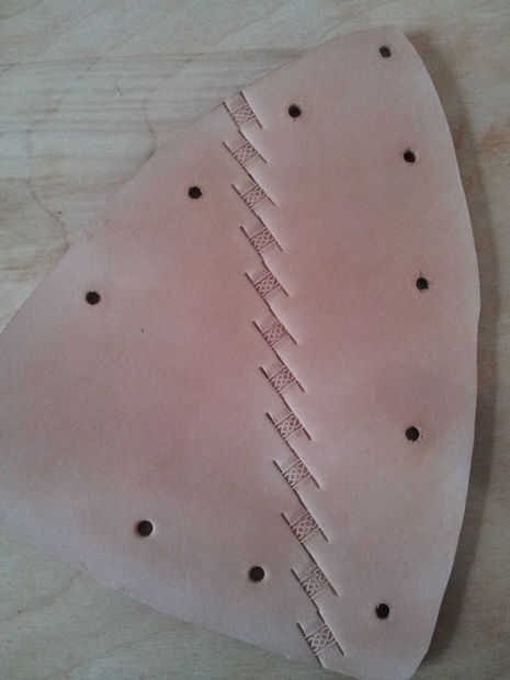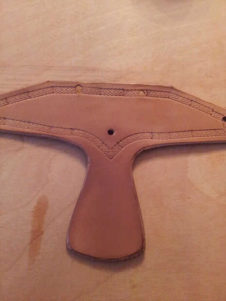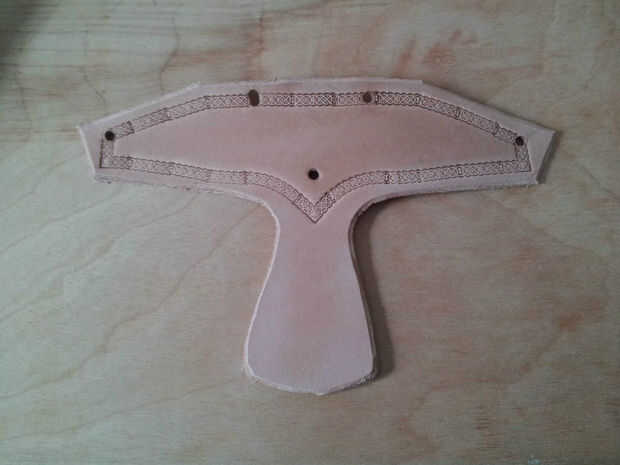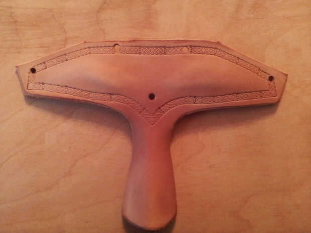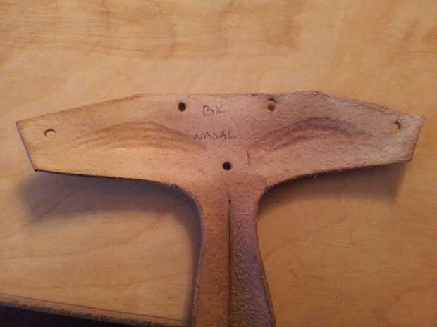 Como paso final, vamos a doblar el protector de nariz un poco repujado para el área de la frente. Repousse es la técnica de empujar el cuero a crear un diseño levantado - en este caso, sólo voy a hacer simple cejas.