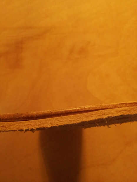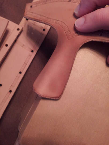 En primer lugar, me voy volver a utilizar la costura ranuradora para arañar una línea justo por la mitad el área de la nariz - esto será la guía para el doblez y creará un ángulo más distinto. Conseguir el cuero mojado otra vez, esta vez del lado del grano y la carne - el más húmedo el cuero más flexible será, pero no sumergirlo. Utilizando una esquina aguda 90 grados (en este caso, mi caja de herramientas de madera) colocar el protector nasal la gubia es exactamente en el borde y luego presione los bordes a lo largo de la longitud. Suavizar las arrugas, ni burbujas y probar y crear como patata a la inglesa un pliegue como sea posible. Como el cuero se seca, mantendrá la forma que has hecho.