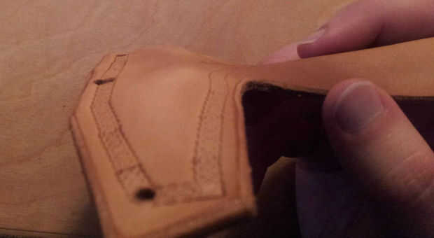 Otra cosa que puedes hacer para añadir Polaco a tu trabajo es pulir los bordes. Para hacer esto, simplemente conseguir el borde del cuero húmedo y luego frote vigorosamente los bordes con el impermeable de borde, o un pedazo de toalla de papel. Esto comprime las fibras y también aficionados al borde para que se oscurezca un poco y da un poco brillo - he incluido un cuadro comparando dos piezas de cuero, que tiene un borde pulido y el otro que no. Ideal sería hacer este paso antes de herramientas, pero lo hice después y no parece causar problemas.