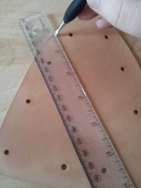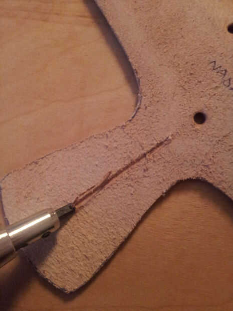 A continuación, coge el sello de su frontera de opción, el protector nasal, diadema y la cubierta de la costura. Tratar el cuero con agua como anteriormente y estampar en una línea recta entre los agujeros de remache (o donde quieras la frontera para ejecutar) para conectar las impresiones. Tenía la intención de hacer lo mismo con las otras dos bandas, pero por facilidad en cambio opté por usar una Ranuradora de costura. Ajuste a la guía de la herramienta que va arañar un canal entre los agujeros de remache en las bandas de F2B y S2S de manera fácil y rápida de añadir decorativos útiles sin mucho esfuerzo.